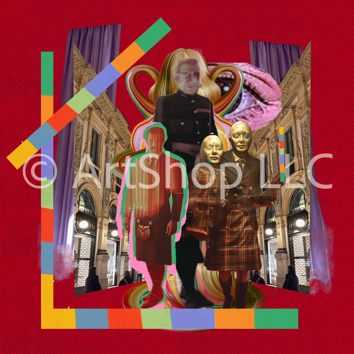 Collage of a fashion style woman walking on red background. multicolored stripes.