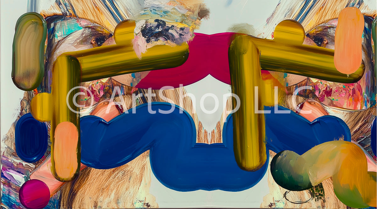 Abstract painting of gold tubes on top of blue organic tube.